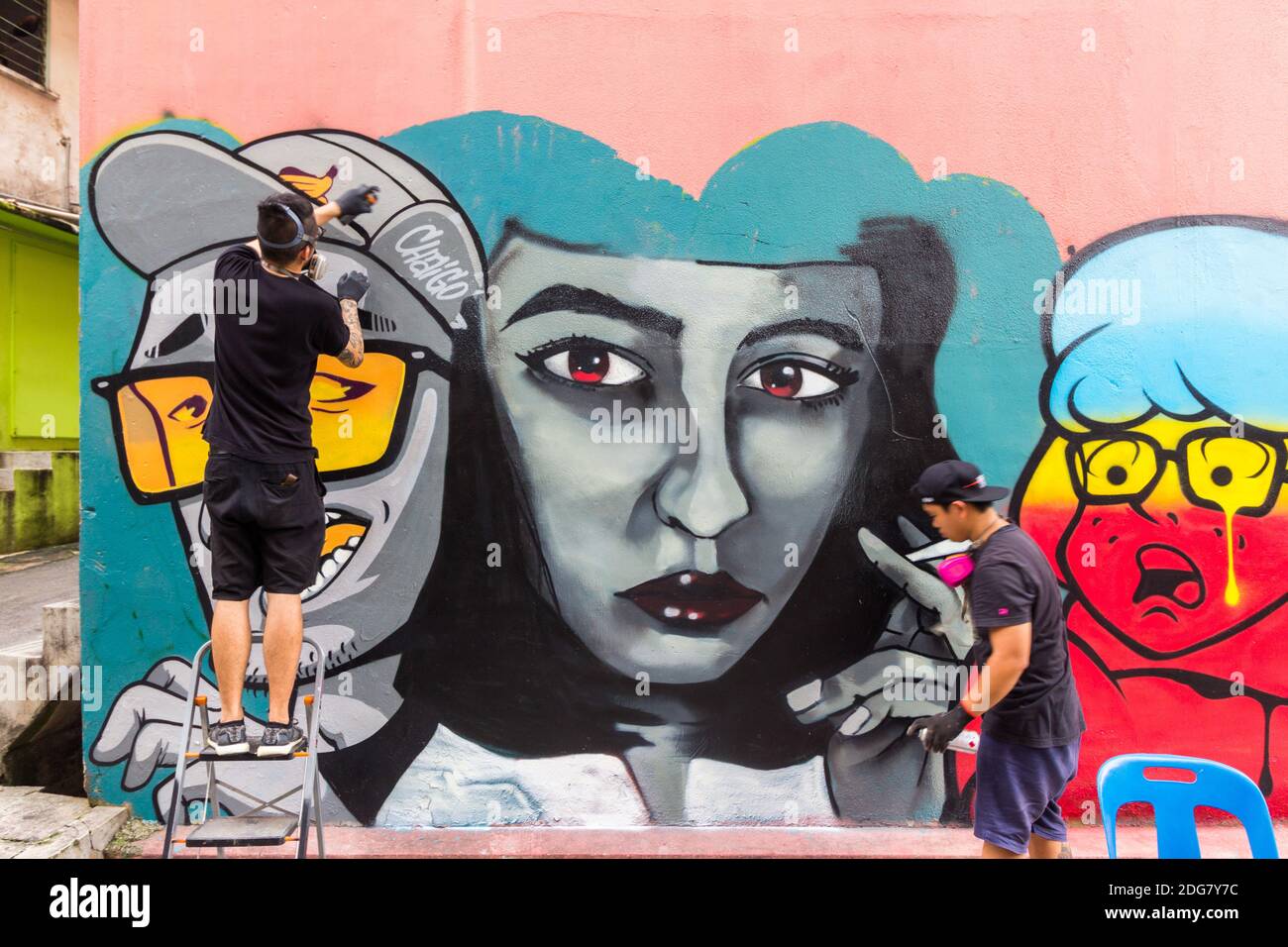 Malaysian Street Artist Kenji Chai Doing A Wall Mural In Kuala Lumpur Malaysia Stock Photo Alamy